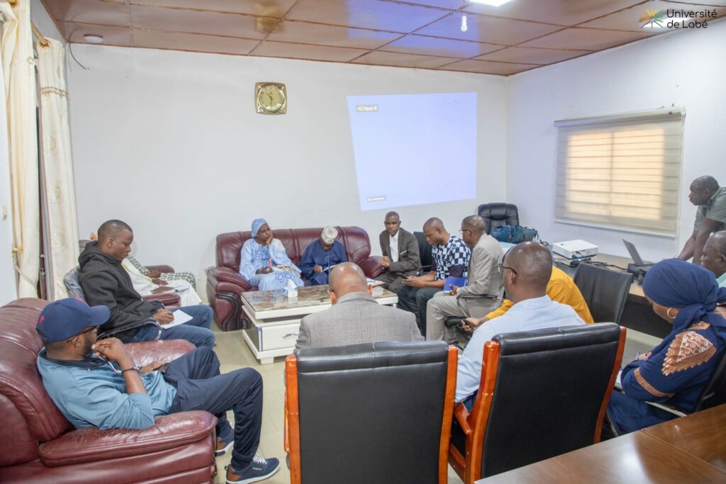 Cette délégation a été reçue par Dr Mohamed Chérif SOW, Recteur, le Dr Lanan Wassy SOROMOU, Vice-recteur, le Dr Moussa DIAKITE, Secrétaire général, Mme Fatoumata DIALLO, Directrice des Relations Extérieures et de la Coopération, M. Mamadi II NABE, Agent comptable, le Dr Abdoulaye Oury BARRY, Responsable de l’unité de Recherche et Formation BioHAFIA, le Dr Mamadou Bailo BARRY, Doyen de la Faculté des Sciences et Techniques, Saa Oscar OUENSENO, Responsable de la Maison de l’innovation, M. Ousmane BARRY, Responsable des laboratoires photovoltaïques, Dr Castro Gbêmêmali HOUNMENON enseignement chercheur en IA, ainsi que certains responsables pédagogiques.